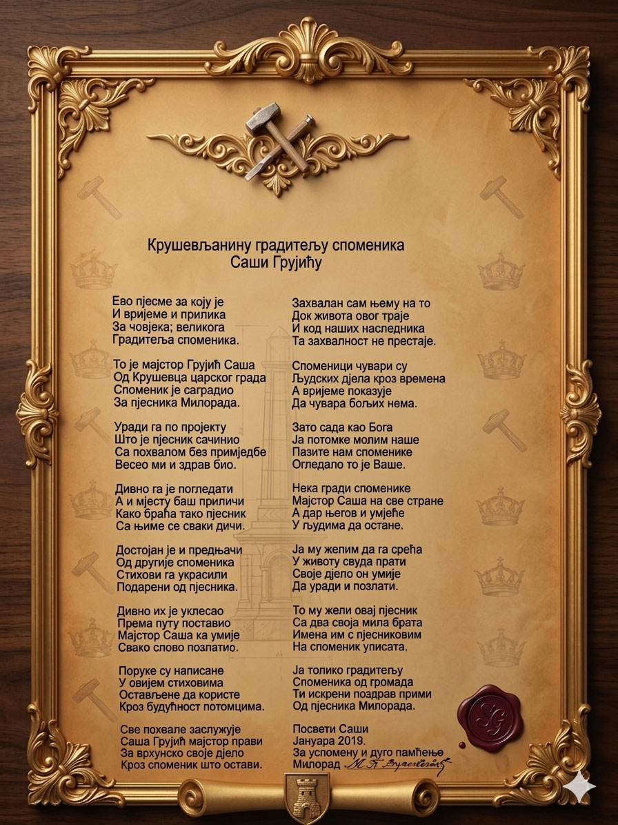 Zanat koji traje decenijama ostavlja traga ne samo u kamenu, nego i u srcima ljudi. Ovo je pjesma koju nam je, iz duboke zahvalnosti, posvetio pjesnik Milorad M. P. Vukićević — posveta majstoru Saši, i dokaz da pravi rad nadživi svaki kamen.